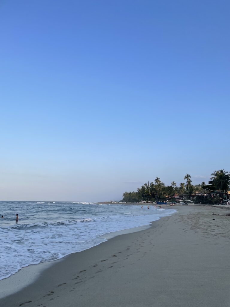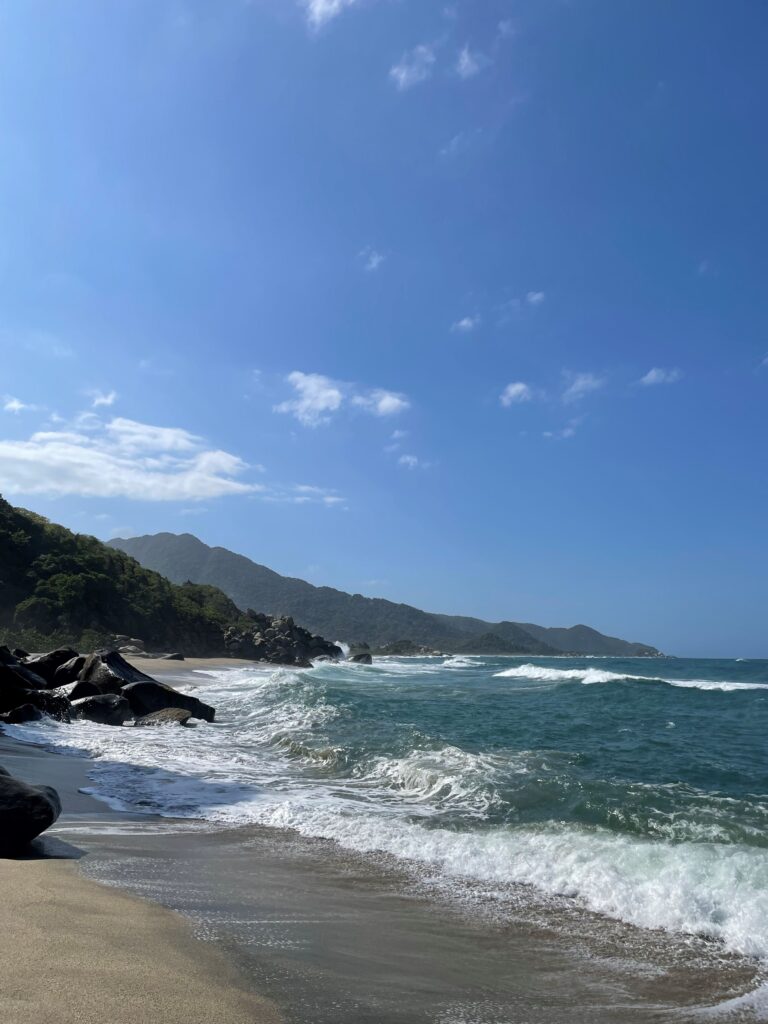 Am letzten Tag sind wir zu einem weiteren Strand neben dem Tayrona Park gefahren, andem das Meer mit einem Fluß zusammentraf. Total genial; auf der einen Seite kalter, klarer, süßer, ruhiger Fluß, auf der anderen; warmes, salziges, rauschendes Meer, mit mega Wellen. Und überall Palmen. Egal wohin man guckt. Das war ein wirklich beeindruckendes Panorama, das man dort tagtäglich hatte. Egal wo man sich befand. Es war immer wirklich wunderschön.